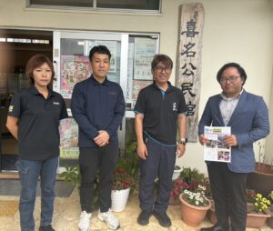 (写真:喜名公民館にて、用務さん、書記さん、自治会長、佐渡山)